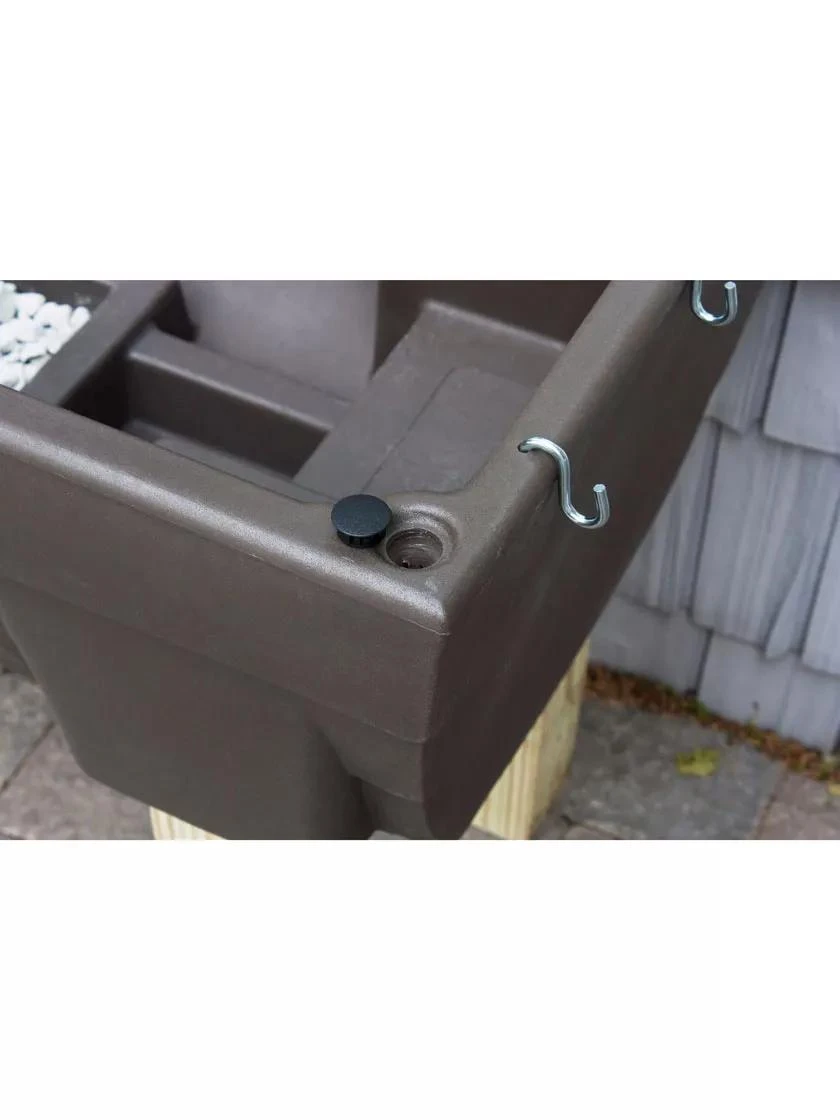 This self-watering elevated garden holds over 10 gallons of water. Raised for easy access without back pain. Includes potting gravel for self-draining functionality, and S-hooks for hanging accessories.