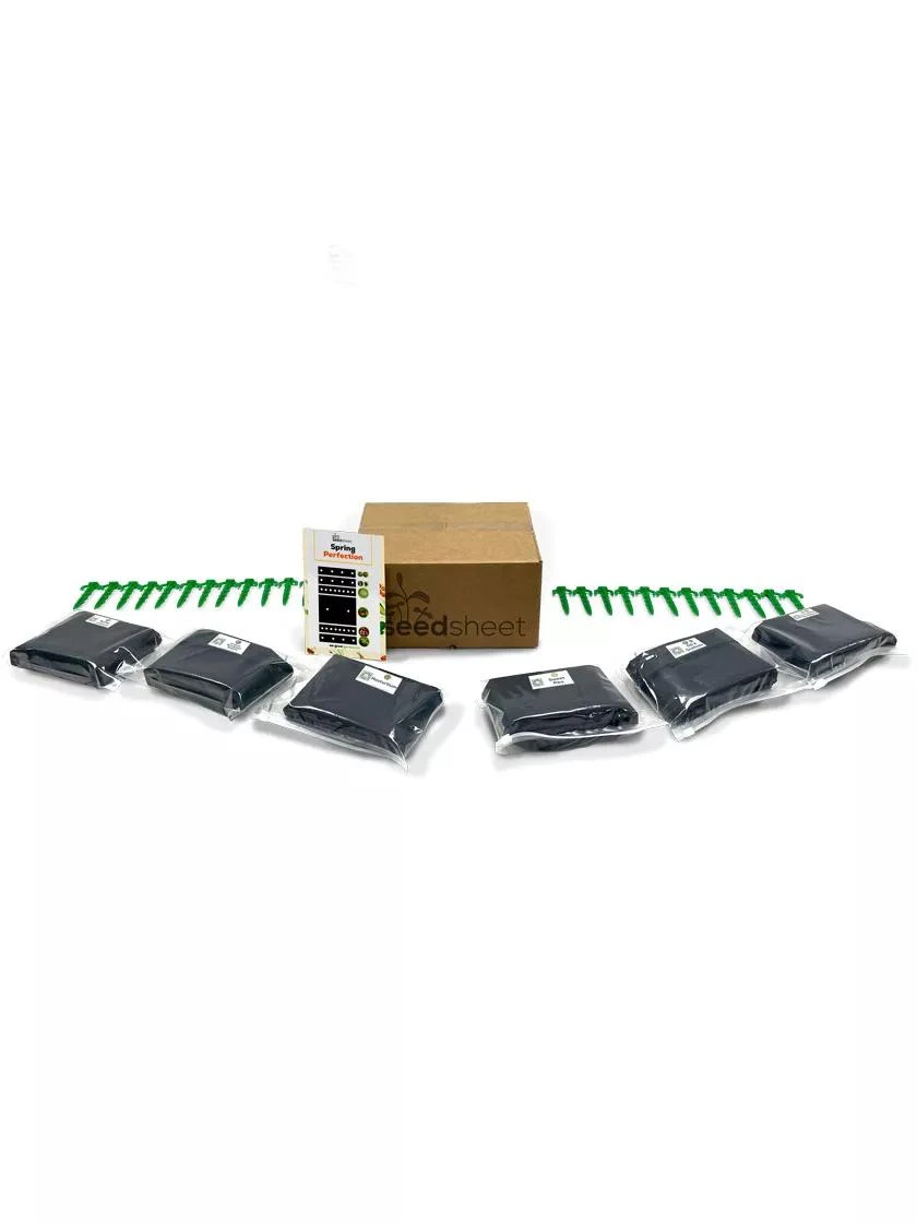 The dissolvable seed pouches are made out of a food-safe polyvinyl alcohol film, most commonly used in gel casings for pills. The permeable weed-blocking fabric keeps weeds at bay without harmful chemicals, and allows for water and air exchange. While sheets arrive in set dimensions, you can easily cut to desired size (just be careful not to cut into seed pouches). Included stakes help to anchor each SeedSheet.